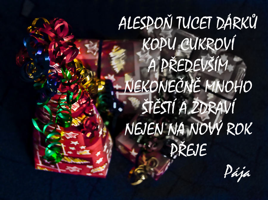 Štědrý den jsem prošvihnul:(, tak snad aslespoň ten Silvestr a následný Nový rok. Takže si to krásně užijte, pijte obligátně s Mírou:) a kdo ho nezná tak aspoň s Dohledem! Dost vtipkování, prostě pohodový dnešek s lidmi, co za to stojí, hodně zábavy a hlavně co nejvíc štěstí a zdraví do tého rocku 2009!!! Všem, kteří si toho budou vážit a těm, co o to budou stát, přeje Admin Pája.